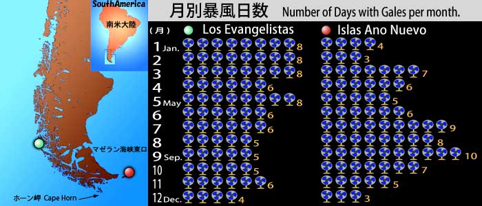 これは手持ちの資料(Sailing Directions for South America 2 by DMA)をもとに作成したもので、チリ多島海の2カ所に於ける月別暴風日数(風力8以上)を表示しています。熱帯低気圧と台風の境目が、風力8(17.2m/s)ですから、風力8がどれほど強いか分かります。