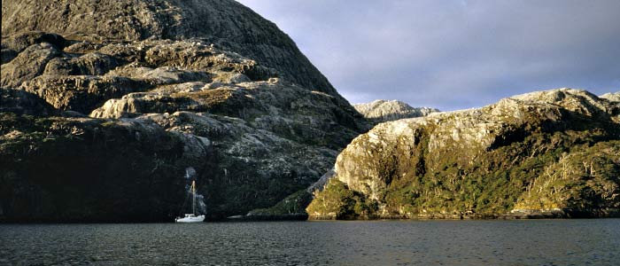 マゼラン海峡のさらに南、南緯54度を超えた水域です。このあたりになると気候は一層厳しく、やはり山々には木々がほとんど生えていません。水辺に低い木々が少し生えるか、草が茂っているだけです。下の写真から分かるように、水路の岸には岩山が並んでいます。