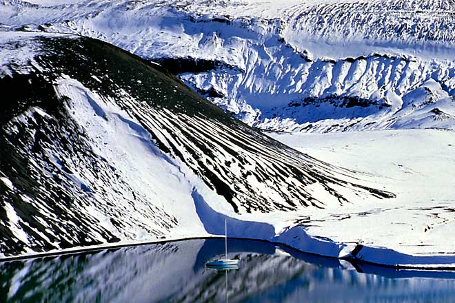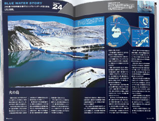 さて、<青海>はさらに島の奥に向けて前進を続けますが、現在位置がよく分かりません。以前にお伝えしたように、遠近感が全くないため、前方の山々までの距離がまず分かりません。もちろん、周囲の地形で位置を確認しようと試みますが、遠くの物も近くの物もベタリと白く重なって見える景色の中では、まるで目の焦点も合わない感じがして、地形もよく分からなかったのです。上の温泉の写真では山が黒く写っていますが、<青海>が着いた当時は、すべてが白銀の世界でした。しかも、海図に描かれた地形は、噴火で変わっているかもしれないのです。実際、測深器で水深を測ると、海底の地形は明らかに海図と違うようでした。何を信じて進めばよいのでしょう?