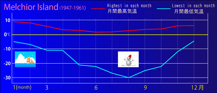 南半球ですから、2月が真夏で8月が真冬です。グラフから分かるように、夏の月間最高気温は、+10度近くまで上昇しています。一方、冬の月間最低気温は-30℃で、日本の北海道程度です。夏場は北海道より寒いとはいえ、ここは南極でも暖かい地方のようですね。