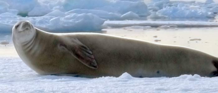 これは ウェデルアザラシ(Weddell seal)です。体長3m、体重500kg程です。体型は丸々と太って見え、人が近づくと、前足の片方を上げながら氷上を横に転がって逃げます。雌は雄よりも少し大きいようです。