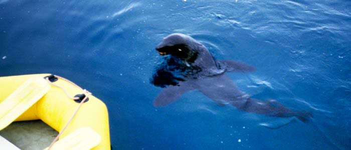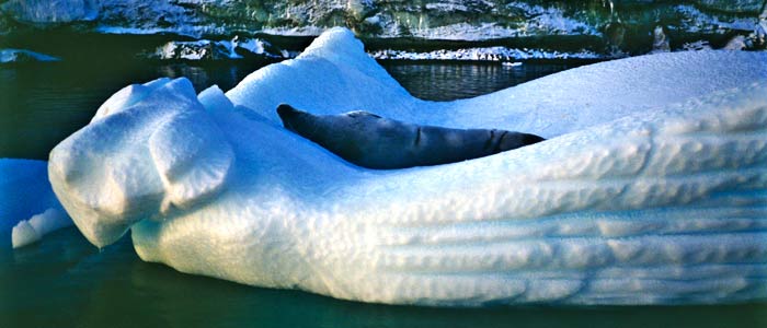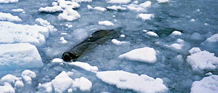 これはロスアザラシ(Ross seal)です。体長2mほどで、犬のような鼻部の突き出しはほとんどありません。歯はとても小さいが、鋭く尖り、イカ等を食べる。威嚇すると、ノドを伸ばして特徴のある音を立てるそうです。写真の顔の部分は、まるで魚ですね。